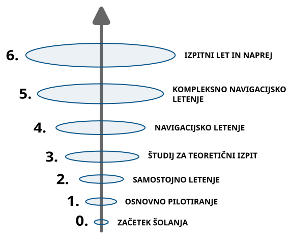 - 4 faze šolanja, ki skupaj obsegajo 45 ur letenja in terjajo 30 obiskov na letališču (šolanje se izvaja na letališču Celje – Levec)*